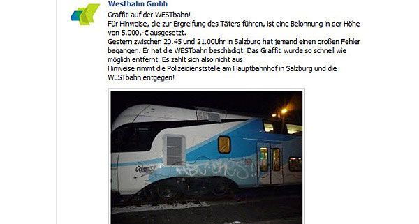 Die Westbahn zog sich am Dienstag im Web 2.0 den Unmut und Spott der User zu, nachdem auf einen Facebook-Kommentar hin mit einer Klage gedroht wurde. Auch das “Kopfgeld”, das sie auf einen Graffiti-Sprayer ausgesetzte, kam gar nicht gut an.