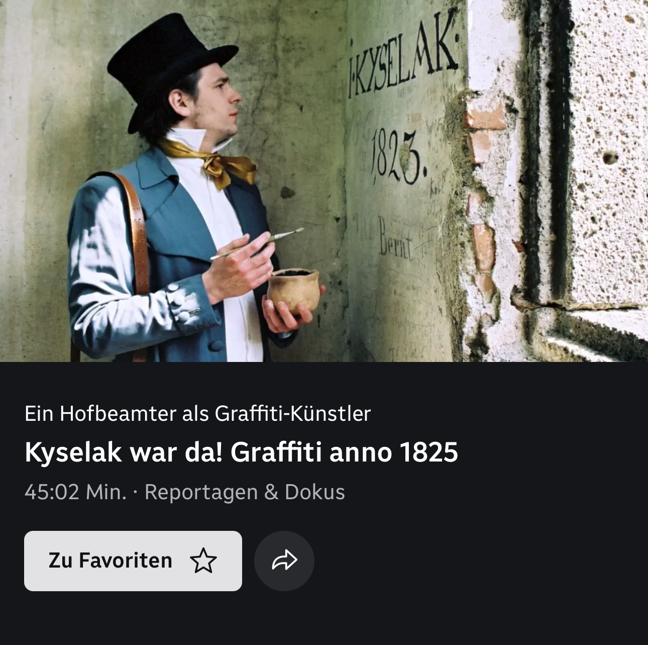 Graffiti galten lange Zeit als Schmuddelkunst, bevor sie vom Kunstmarkt aufgewertet wurden. Die Ikone der Sprayer war sonderbarerweise ein Wiener Hofbeamter, Joseph Kyselak. Am Anfang des 19. Jahrhunderts erlangte Kyselak dadurch Berühmtheit, dass er auf Wanderungen seine Signatur hinterließ. Er schrieb seinen Namen nicht einfach auf, sondern benutzte dafür eine Schablone und schwarze Ölfarbe. Etwa sechzehn dieser Signaturen haben sich über fast 180 Jahre erhalten. Angeblich gibt es davon auch noch welche am Fuijama, am Kilimandscharo, und am Kölner Dom. Spätere Generationen machten aus Kyselak einen legendenumwobenen Urvater ihrer eigenen Kunst. Die Dokumentation geht der Frage nach, wer Kyselak wirklich war?
