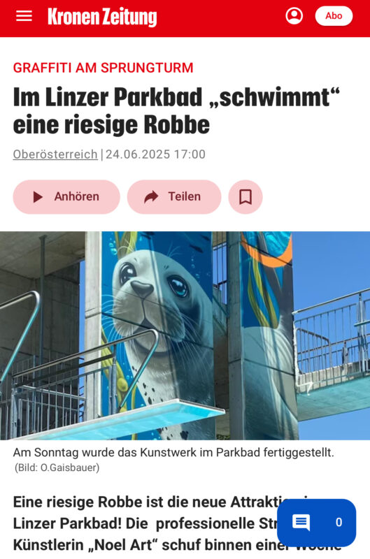 Eine riesige Robbe ist die neue Attraktion im Linzer Parkbad! Die professionelle Street-Art-Künstlerin „Noel Art“ schuf binnen einer Woche am Sprungturm ein Graffiti-Werk, das die Gäste wie auch die Bademeister begeistert. Es ist nicht das einzige sehenswerte Kunstwerk der aus dem Bezirk Perg stammenden 28-Jährigen