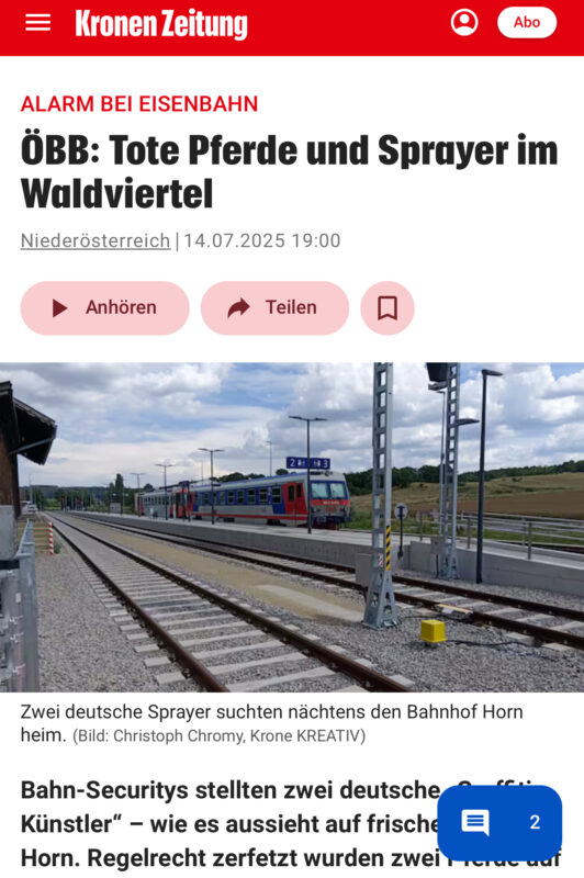 Bahn-Securitys stellten zwei deutsche „Graffiti-Künstler“ – wie es aussieht auf frischer Tat – in Horn. Regelrecht zerfetzt wurden zwei Pferde auf der Franz-Josefs-Bahn im Waldviertel. Auch ein drittes Ross verendete.