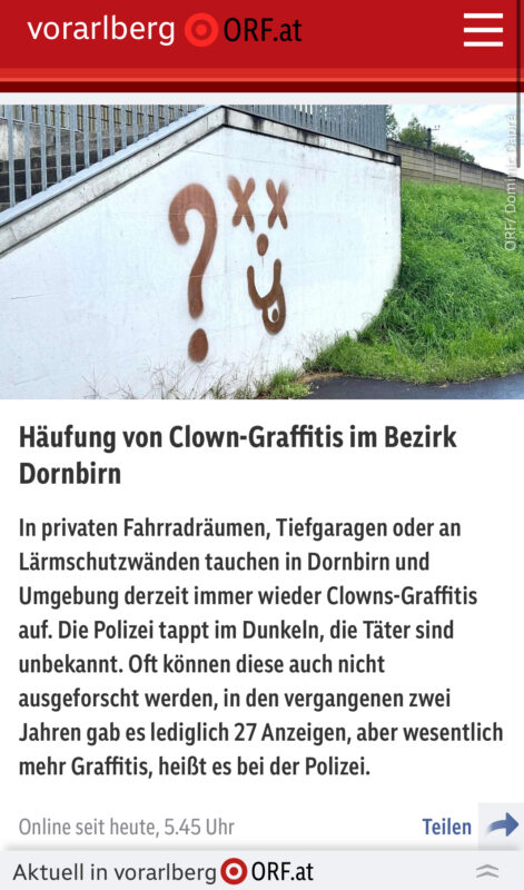 In privaten Fahrradräumen, Tiefgaragen oder an Lärmschutzwänden tauchen in Dornbirn und Umgebung derzeit immer wieder Clowns-Graffitis auf. Die Polizei tappt im Dunkeln, die Täter sind unbekannt. Oft können diese auch nicht ausgeforscht werden, in den vergangenen zwei Jahren gab es lediglich 27 Anzeigen, aber wesentlich mehr Graffitis, heißt es bei der Polizei.