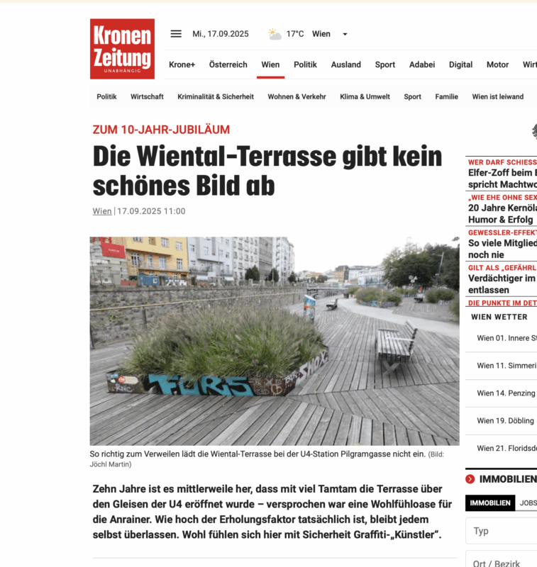 Zehn Jahre ist es mittlerweile her, dass mit viel Tamtam die Terrasse über den Gleisen der U4 eröffnet wurde – versprochen war eine Wohlfühloase für die Anrainer. Wie hoch der Erholungsfaktor tatsächlich ist, bleibt jedem selbst überlassen. Wohl fühlen sich hier mit Sicherheit Graffiti-„Künstler“.
