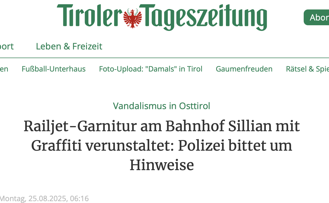 Mayrhofen – Eine am Bahnhof Mayrhofen abgestellte Zuggarnitur wurde in der Nacht auf Sonntag mit einem Graffiti besprüht, berichtet die Polizei.