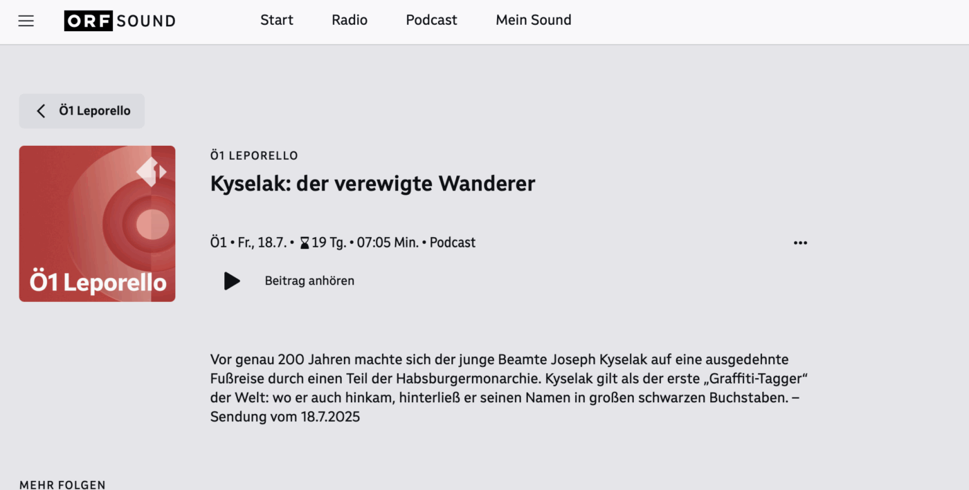 Vor genau 200 Jahren machte sich der junge Beamte Joseph Kyselak auf eine ausgedehnte Fußreise durch einen Teil der Habsburgermonarchie. Kyselak gilt als der erste „Graffiti-Tagger“ der Welt: wo er auch hinkam, hinterließ er seinen Namen in großen schwarzen Buchstaben. – Sendung vom 18.7.2025
