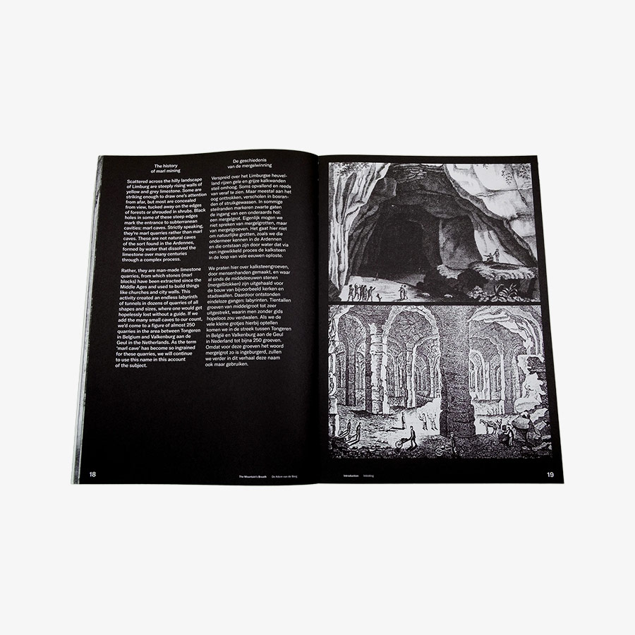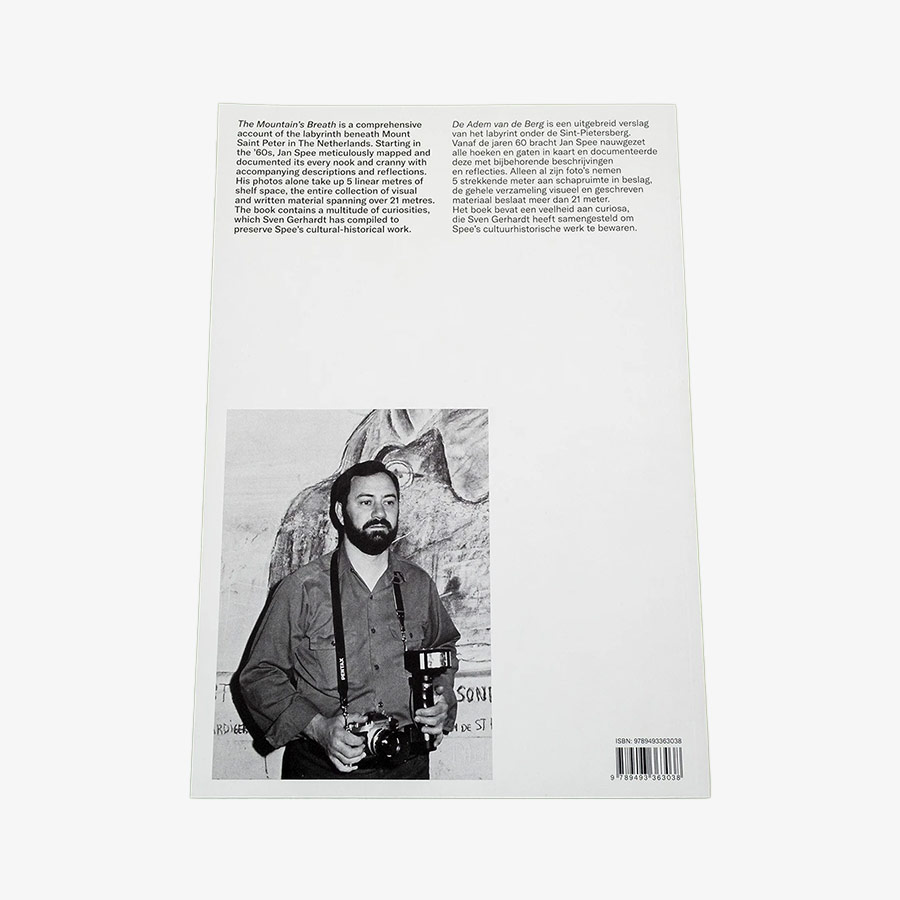 The Mountain’s Breath (De Adem van de Berg) is a comprehensive and diverse account of the labyrinth under the Sint-Pietersberg. It mimics a visit inside the mountain with the knowledgeable and articulate Jan Spee as a guide. The book is filled with a multitude of curiosities, which Sven Gerhardt (NL) has compiled to preserve Spee’s cultural-historical and visual observations and make them accessible. The book gives an overview and provides context and cross-references to a large selection of images, interspersed with archival material about life in the quarries.